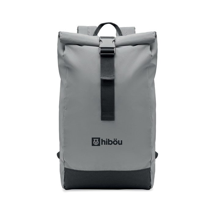 Plecak na laptop 15 cali typu rolltop z odblaskowego poliestru 190T. Dodatkowe zapięcie na rzep. Wyściełane plecy, szelki i spód. Przednia kieszeń na zamek błyskawiczny. Część dolna z poliestru 600D z recyklingu.
